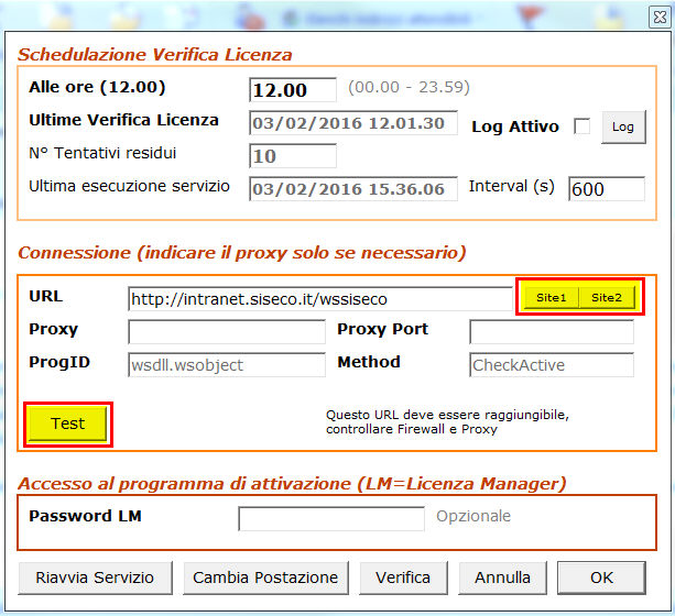 In caso di problemi di connessione al server di SISECO per la verifica della licenza, è possibile impostare la connessione verso un server di backup dalle opzioni del License Manager premendo il pulsante “Site2”; dopo averlo fatto, si può controllare la connessione premendo il pulsante “Test” e, in caso di esito positivo, si possono salvare le impostazioni con “OK” e procedere alla verifica manuale della licenza.