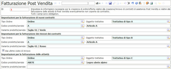La pagina di configurazione della fatturazione Post Vendita permette di indicare il tipo di Ordine/Offerta, l’oggetto trattativa e il prodotto/servizio predefiniti per i tre diversi casi di fatturazione (nuovi contratti, rinnovi dei contratti e attività legate a una segnalazione):