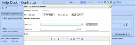 Nel primo caso, è sufficiente selezionare un Ordine/Offerta dal menu a tendina “Prot. Int.”, che viene caricato con gli Ordini/Offerte relativi al cliente che ha sottoscritto il contratto; nel secondo, si deve fare clic sul pulsante “Nuovo ordine” e il CRM provvederà a creare un Ordine/Offerta con le impostazioni di default relative al cliente e all’utente che esegue l’operazione.