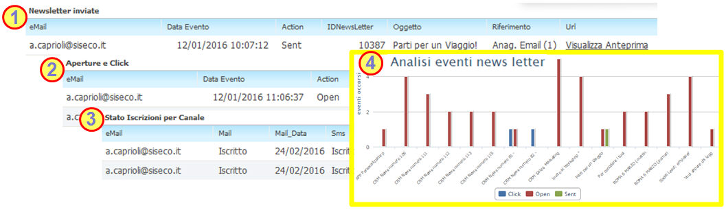 Analisi Eventi Newsletter: ognuna con dettagliato N° inviate, N° aperte e N° con click.