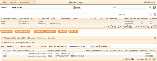 Quando si cerca un'anagrafica da Clienti e Prospect, nella parte inferiore dell'interfaccia si possono visualizzare le Sintesi CRM presenti nel sistema (e visibili dall'utente).