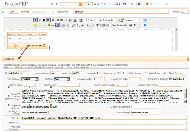 La Sintesi CRM può essere composta da diversi pannelli informativi, ciascuno dei quali può contenere semplici griglie informative oppure interfacce realizzate con il macrolinguaggio Simple#.