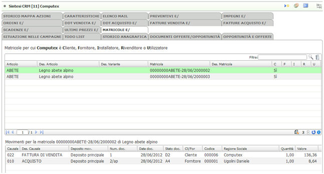 Esempio scheda “Matricole e/” che riporta l’elenco delle matricole per cui l’anagrafica è Cliente, Fornitore, Installatore, Rivenditore o Utilizzatore; un pannello di drill-down permette di visualizzare tutte le movimentazioni della matricola selezionata.