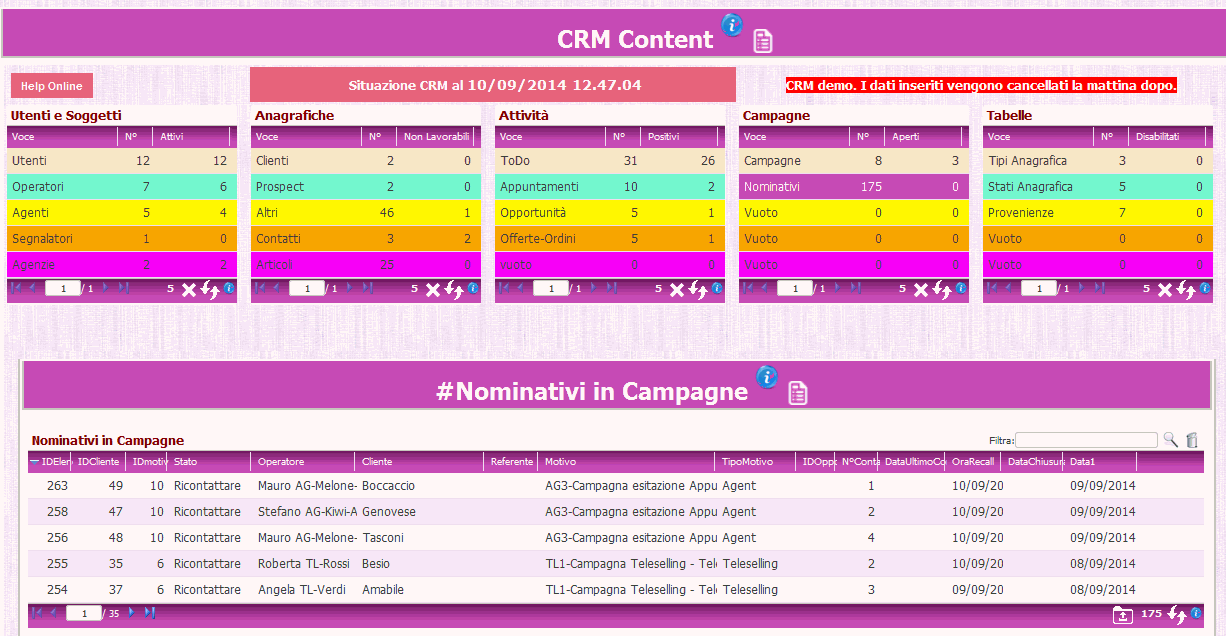 CRM Content: che fornisce a colpo d'occhio gli indicatori e i relativi dettagli delle attività svolte col CRM (22 moduli)