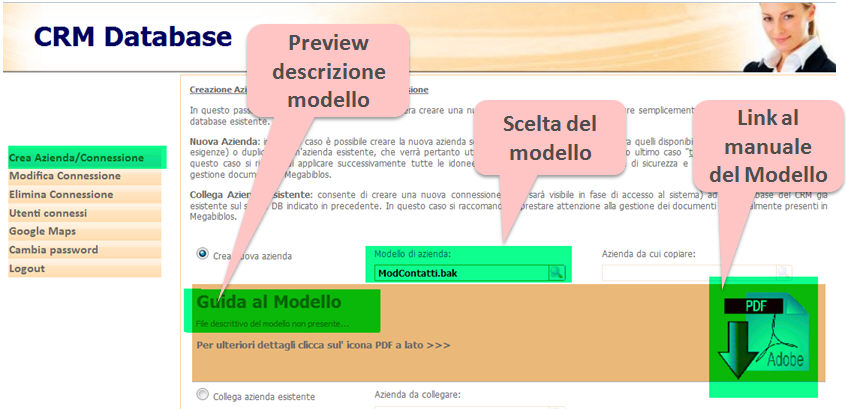 Collega Azienda Esistente: consente di creare una nuova connessione (che sarà visibile in fase di accesso al sistema) ad un database del CRM già esistente sul server DB indicato in precedente. In questo caso si raccomanda di prestare attenzione alla gestione dei documenti eventualmente presenti in Megabiblos.