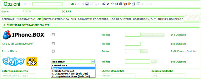E' possibile selezionare una sola integrazione per volta e può essere anche differente per ogni utente del CRM. Come valore predefinito nessuna integrazione CTI è abilitata.