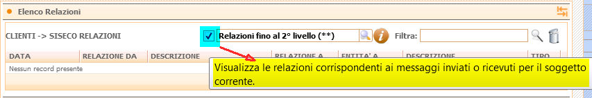Spuntando la casella a fianco il box "Relazioni ..." vengono visualizzate anche le relazioni relative ai messaggi inviati o ricevuti (relazioni di 2° o 3° livello).