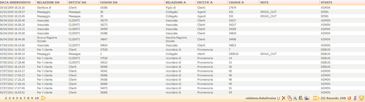 Attualmente le relazioni si possono creare su (e tra) queste entità: Agenti, Clienti, Fornitori, Listino, Motivi, Opportunita, Ordini, Utenti, Clienti_Indirizzi, Contatti.
