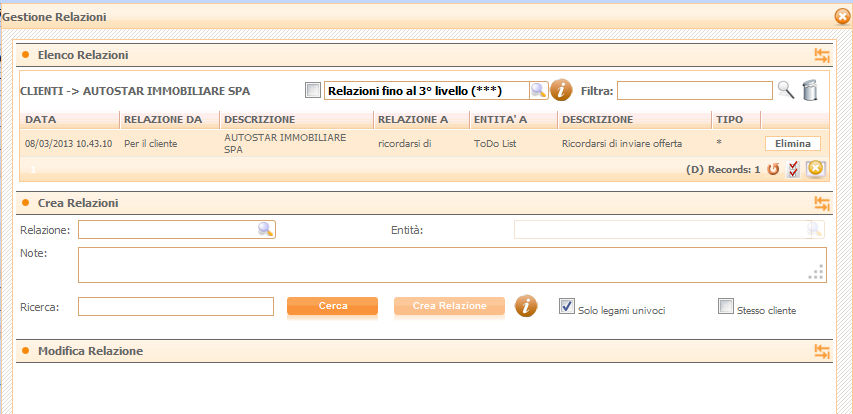Si apre un apposito menu che ci permette appunto di creare delle relazioni tra il cliente che stiamo visualizzando ed il resto del database (es. altri clienti od altre aziende, oppure relazioni familiari, come "nipote di", "padre/madre di" ecc.). Si possono creare nuove relazioni oppure eliminare quelle non più esistenti, si possono modificare le note di quelle presenti oppure eliminarle.