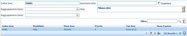 Ogni zona ha un proprio codice identificativo (Codice Zona), una descrizione per identificarla (Descrizione Zona) e l'opzione “Disabilitata” per renderla obsoleta.