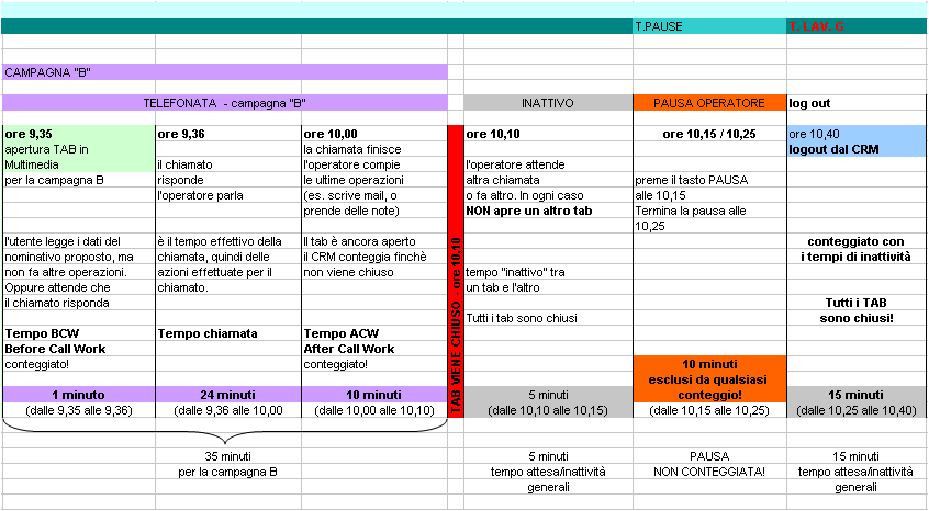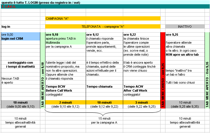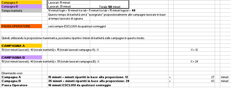 Il "tempo di inattività" indicato in grigio scuro (login, tempi tra una telefonata e l'altra, tempo tra la fine dell'ultima telefonata ed il logout) sono ripartiti equamente tra le campagne in base ad un conteggio proporzionale.
