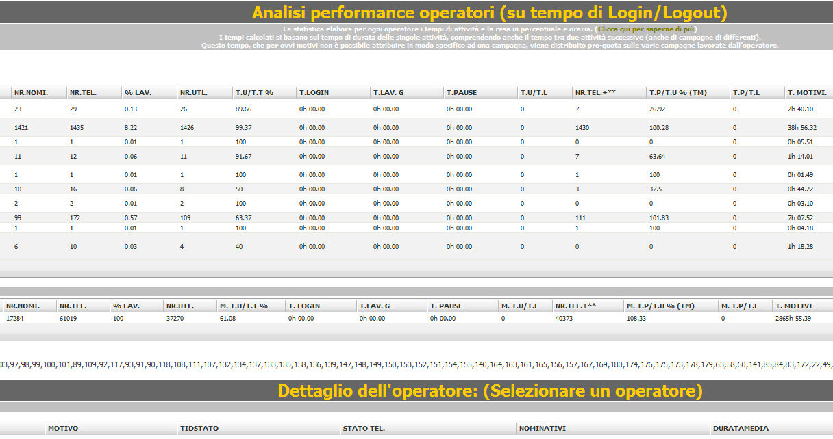 La statistica elabora per ogni operatore i tempi di attività e la resa in percentuale e oraria.