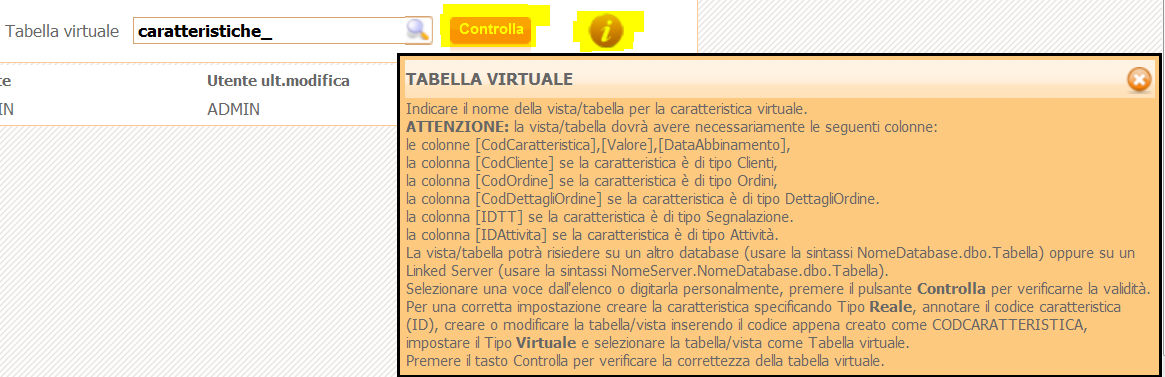 Il campo "tabella virtuale" identifica la “tabella” che dovrà essere legata a questa caratteristica virtuale (ci sono già degli esempi predefiniti, es. clienti, comuni, parametri, ecc.). Nel nostro caso useremo la tabella virtuale CARATTERISTICA_VIRTUALE_ESEMPIO che andrà prima generata come segue.