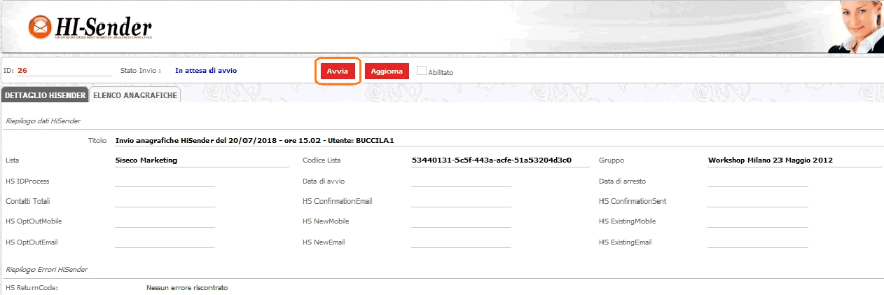 In caso di anomalie nell’invio verso Hi-Sender, il pulsante Reset-RiAvvia permette di eseguire nuovamente il processo di caricamento senza dover rilanciare il wizard di invio anagrafiche.