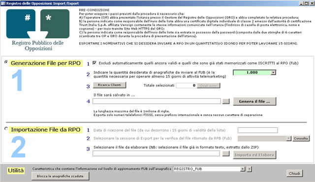 Creare il file ASCII da inviare al Registro delle Opposizioni con un quantitativo di contatti (in scadenza o da verificare) idoneo alle proprie esigenze contingenti, sapendo che il FUB risponde nell'arco di 24 ore. Grazie al concetto di CRM il file ASCII per il FUB conterrà una sola volta il numero telefonico anche se lo stesso fosse presente in più campagne