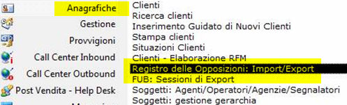 Quando il modulo sarà attivo, si visualizzerà una nuova voce nel menu Anagrafiche, precisamente sarà disponibile l’opzione REGISTRO DELLE OPPOSIZIONI IMPORT EXPORT.