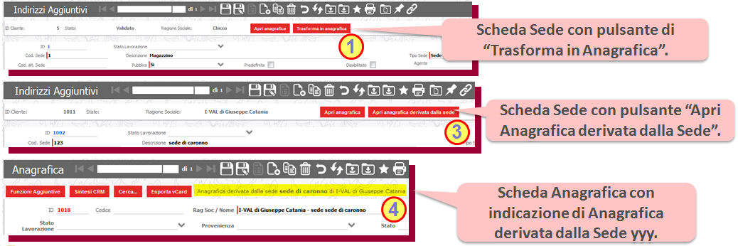 Nella scheda della Sede appare un pulsante “Trasforma in anagrafica” che genera l’anagrafica.