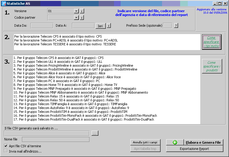 Questa parte indica i tipi di attività attualmente presi in considerazione per l’estrazione delle statistiche, ovvero lavorazioni CPS, PC+ADSL e TESSERE.